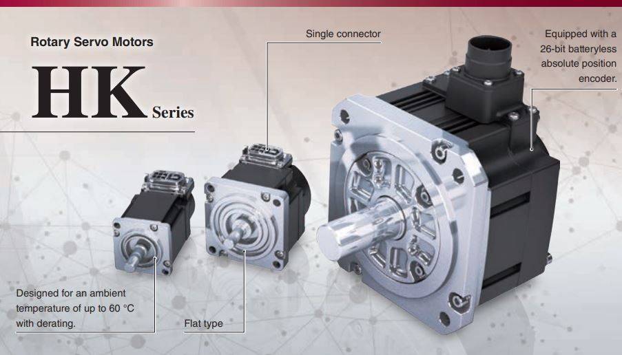 Les servomoteurs HK-KT, déclinés en 200V et 400V, intègre un codeur de position absolue sans batterie 26 bits, et supporte une vitesse nominale de 3000 tours par minute (6700 tours par minutes max.), et sont dotés d'un connecteur tout-en-un, ce qui simplifie le raccordement. Le connecteur unique de la série HK-KT combine l'alimentation du moteur, le codeur et le frein électromagnétique en un seul câble. Le One-Touch Lock élimine la nécessité de serrer les vis, ce qui facilite le câblage. Les servomoteurs sont également compatibles avec le type de câble double. Les câbles peuvent être montés horizontalement ou verticalement, selon votre choix.